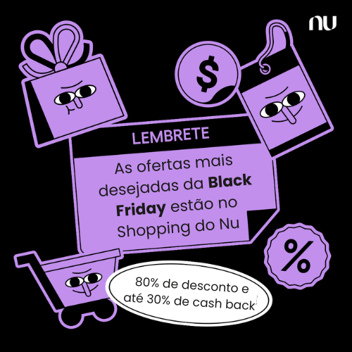 O Nubank também oferece oportunidades exclusivas durante a Black Friday, principalmente pelo Shopping do Nubank. Os clientes que iniciam suas compras pelo aplicativo têm acesso a descontos especiais, cashback e a garantia de segurança ao comprar em lojas online confiáveis.